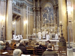 About one hundred twenty people were there, the median age seeming to be in their early 50’s, with a pretty good mix from two or three small children to people old enough to have been formed in this rite. We had a crowd of about fifteen students from the pontifical universities, most of whom are regulars. I only saw a couple of mantillas in the whole assembly. A small pamphlet had the readings and some prayers in Latin and Italian. The major parts of the mass were recognizable from the current form of the Rite, and from what I remember studying in my Liturgical history courses. Announcements and collections are not much different, though the former came in the middle of mass rather than at the beginning or the end.