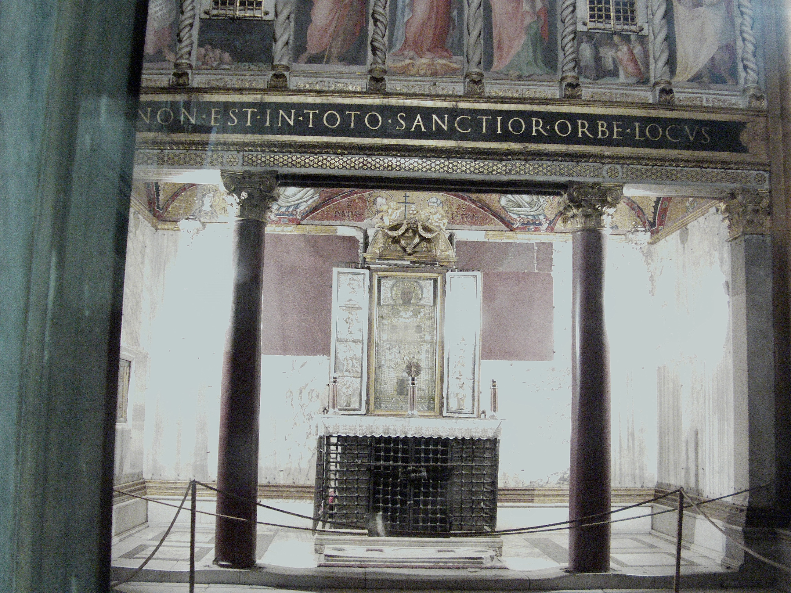 Across the street is the Santa Scala (the Holy Stairs) which, according to pious legend, were brought to Rome by St. Helen in the early 4th century from the praetorium of Pontius Pilate in Jerusalem where Jesus stood in trial before the Roman authority that condemned him to death. They were originally placed of the Lateran palace, but moved to the current site in the late 17th century. Here they ascend to the Sancta Sanctorum (Holy of Holies), once the private chapel of popes and so-called because of the extent of the reliquary contained therein. The inscription above the chapel at the top of the holy stairs even reads non est in toto sanctior orbe locus (Nowhere in all the world is holier than this place).