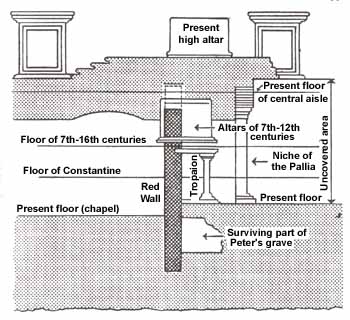 It was in the midst of this necropolis that a small shrine was built up against a red wall. Over the few hundred years between the construction of the shrine and its being covered by Constantines basilica, more and more Christians were found to be buried as close as possible to the shrine, often without care for previous graves so that several layers of graves were found right on top of one another radiationg out fromthis shrine. But the shrine itself remained undisturbed.