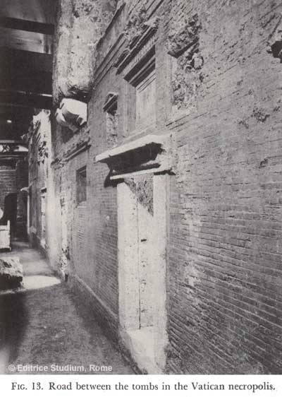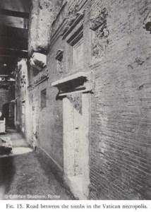 Before Constantine legalized Christianity in the Roman empire and began to build imperial unity by building churches, the Vatican was a hill, on the slopes of which was a Necropolis – a city of the dead. Mausoleums constructed literally as houses for the dead, pagan and Christian side by side (or on top of each other) in family plots clustered around the area. In order to build his massive basilica, Constanitne ordered the hill leveled and the slopes filled in, up to about the roofline of many of the houses of the dead, which were then filled with rubble and debris to make room for the basilica platform.
