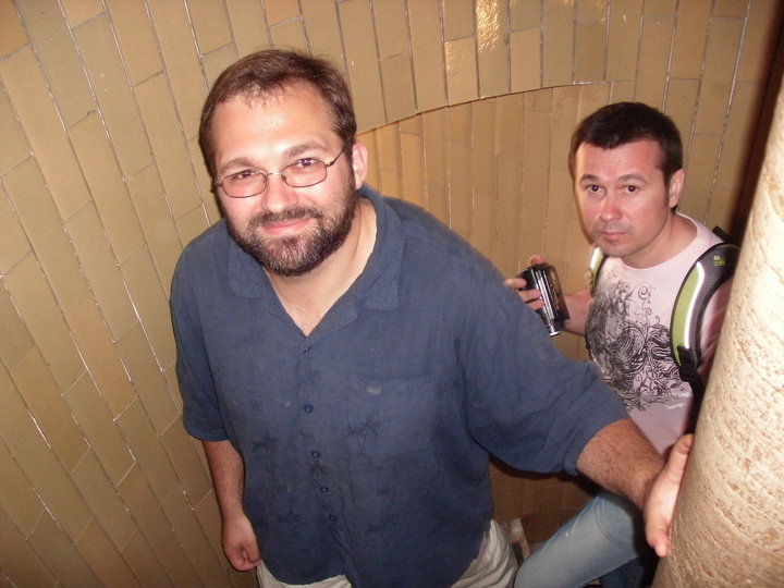 Then we went up. A gently sloping ramp wide enough for four leads to some normal staircases, then a winding spiral staircase big enough for one (no railing) that ends just about the time you wonder whether it ever will. That brings you to the curving level of the cupola itself, and you can actually see the inward curve, which gets steeper until someone my size has to bend over and lean to the right to get through. One more spiral staircase built for people half my size with tiny feet, and we finally make it out to fresh air.