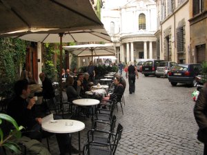 Saturday, June 19 – A Danish friend and I decided to get together for coffee and some conversation about mid morning. This time we met near the famous and picturesque Café della Pace, which is the quintessential Roman café – cobblestone street, outside seating, low traffic and a church nearby, all within a couple blocks of Piazza Navona. It comes with quintessential pricing too, so we opted for a humbler, and homier, bookstore/coffee house across the street that charges no more to sit down than to take your coffee at the bar. Two hours later we wander to the Pantheon for lunch on the steps, taken from a pizzeria popular with the municipale – the Roman city cops.