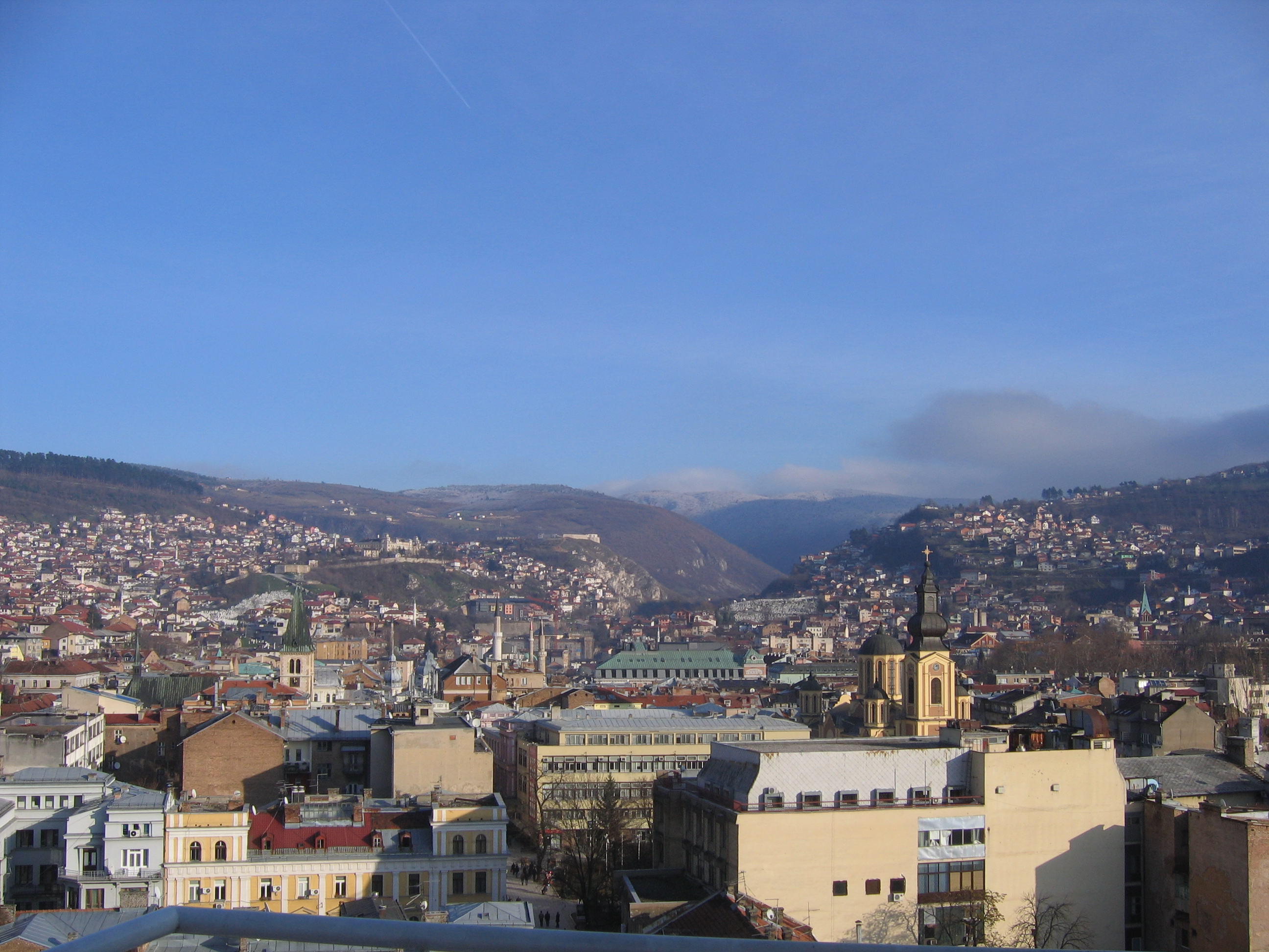 The siege of Sarajevo was contemporary with my four years in high school, 1992-96. Now, nearly fifteen years later, the city is in good shape and relations seem markedly better, but just as there are some signs of the previous destruction – a few buildings with bullet holes or shrapnel damage, some still gutted, an abandoned and burned out pickup truck, and a few Sarajevo Roses still to be seen – so too is there still some evidence of the ethnic and national tensions.