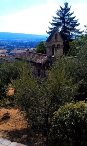 Though I usually try to spend the night, a visiting friend and I made a day trip to Assisi. I have been there in all seasons but the height of summer, until now. By now, I have reported on all the major sites, and mentioned before my favorite little church, essentially untouched in its 900 year history, Santo Stefano.