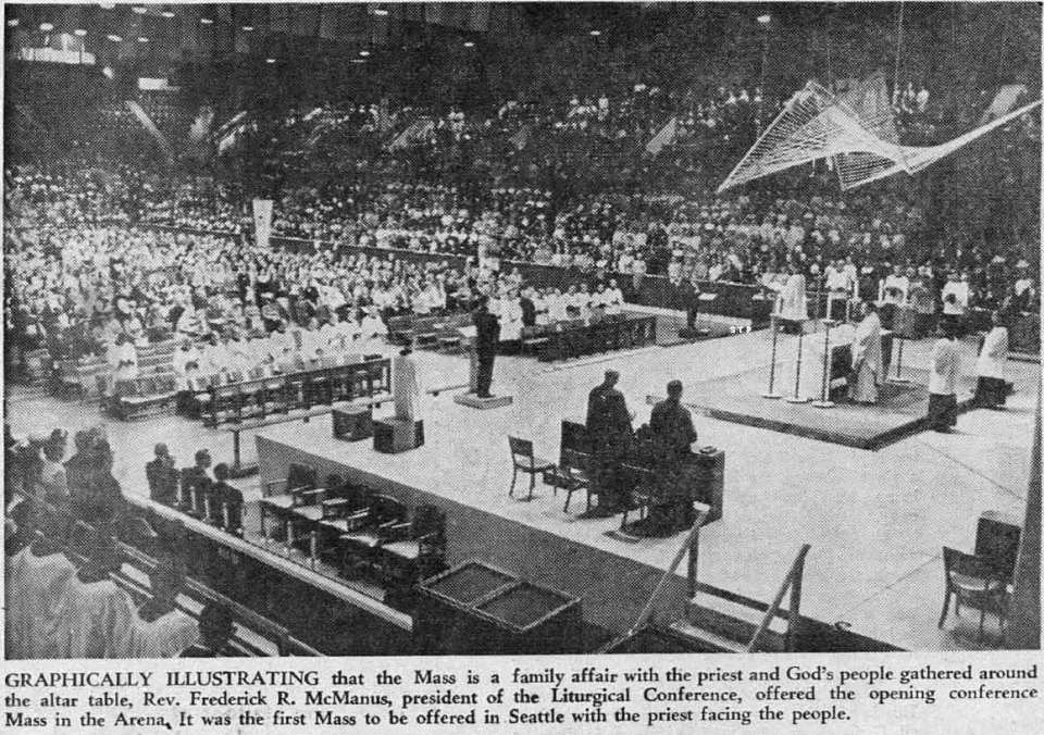 But there will be one very noticeable change at the Conference Masses in the Arena: through a special indult from Rome, all of them will be celebrated facing the people! I wonder what that will be like. I’m especially wondering what it will be like at the concluding Mass when Archbishop Connolly is scheduled to be the celebrant. I’m not sure he is completely favorable to all the latest liturgical developments (which are really not new at all but far more ancient than what we have grown up with), but I suspect he’ll be a good sport and do his best. One thing is for certain: like the Space Needle and the other exhibits of the World’s Fair, the Liturgical Week promises to give us a glimpse of the future. It’s one I can’t wait to see!