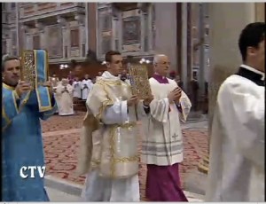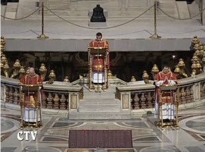 I found this interesting, though: Over the last few years in liturgical circles we have been encouraged to discourage the reading of the Passion in parts, as it is often printed in the missalletes and music books, and instead just have three deacons or readers proclaim the reading in turn. At the papal liturgy at San Pietro, with the ‘new’ Marini in charge, they had each deacon proclaim different parts (Narrator, Jesus, Peter/others) and the choir as the crowd/assembly.