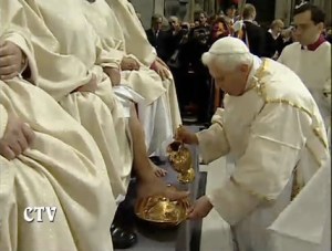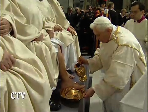 Twelve presbyters were the mandatum at the Holy Thursday Mass of the Lord’s Supper, whose feet the Holy Father washed, though none of this was visible to me. The diplomatic corps were invited to communion with the Holy Father as minister, which they recieveed kneeling and on the tongue, or, they recieved a blessing instead of communion, if appropriate; but everyone else recieved communion along the aisles (standing, and in tongue or hand as the communicant prefered).