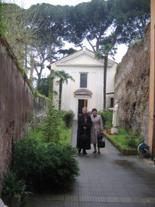 For Easter Sunday, between the full papal Triduum experience and the rain, I decided to go to the little church served by the Trinitarian Fathers, Chiesa San Tomasso in Formis (St. Thomas in Chains), literally just outside our front gate and around the corner. About 30 people filled the church, including two priests and two other Lay Centre folk, director Donna Orsuto and visiting scholar Dr. Aurelie Hagstrom, chair of the theology department at Providence College in Rhode Island who is here for a month of Marian research. Such a different experience after the big liturgies to be in a small community! The only space for the after-mass social was the tiny sacristy behind the altar, as long as we entered from one side and exited the other!