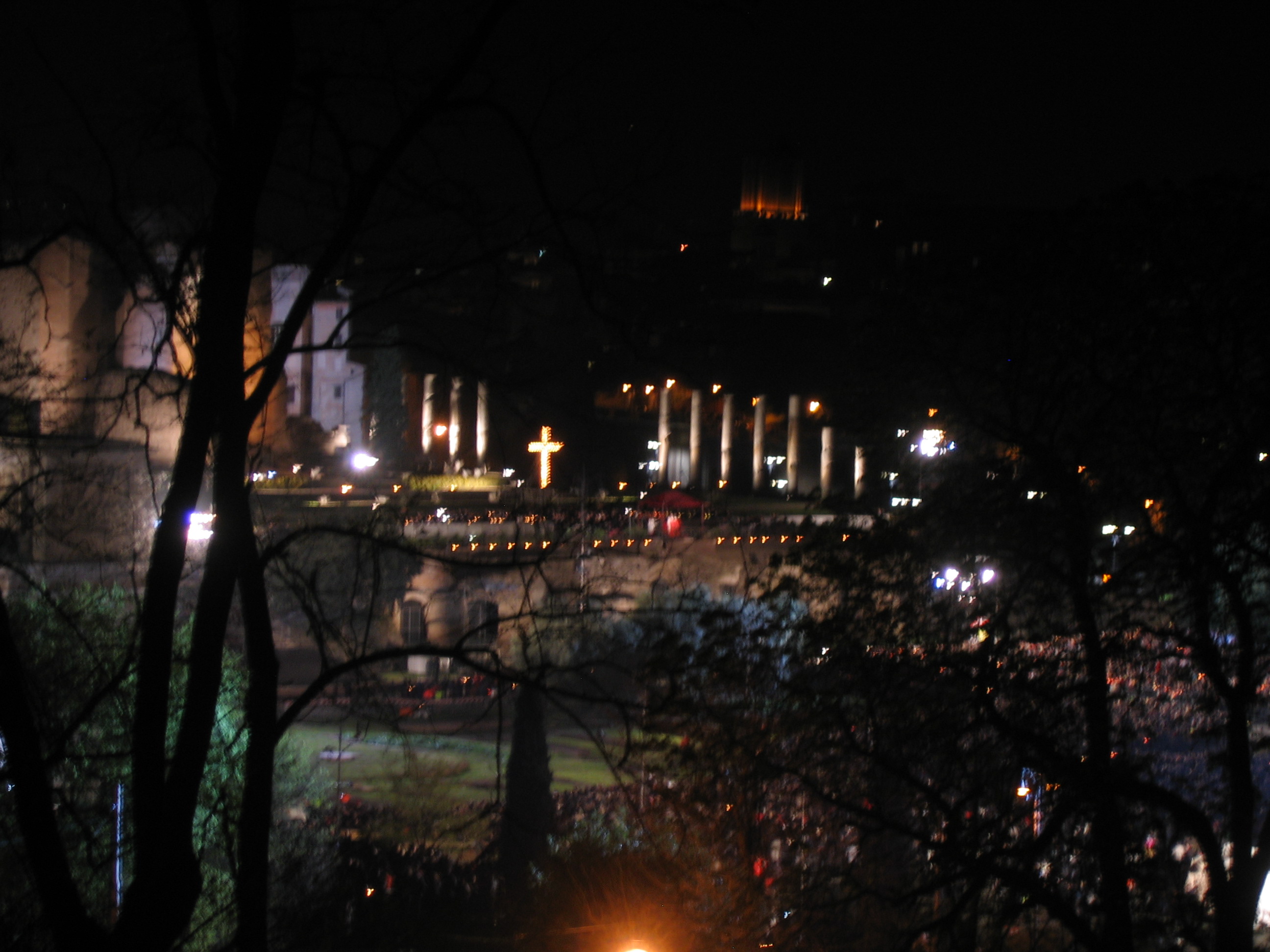 This is, after all, the first church (not in chronology, but in order). The Mass of the Lord’s Supper on Holy Thursday was celebrated at the Pope’s Cathedral, the Archbasilica of Saint John Lateran, Mother-Church of Rome. The Service of Our Lord’s Passion on Good Friday and the Great Vigil of Easter were celebrated at the Vatican Basilica of Saint Peter. All were presided by the Bishop of Rome, Benedict XVI, and he was homilist at the first and last (Raniero Cantalamesa, OFM Cap., the preacher of the papal household, had the homily on Good Friday, as you may have heard.) I prayed the Way of the Cross from the edge of our property, a bluff overlooking the Coliseum with clear line-of-sight of the Holy Father about 300 meters away.