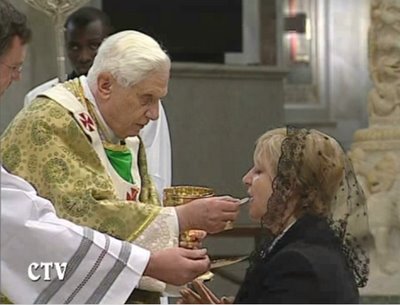 The first time this happened to me, it was quite jarring. There has been no announcement that I have found, it was just a change. In fact, it seemed that many of the Eucharistic ministers (who are always priests during the papal liturgies, though not necessarily so at other liturgies there) had not been informed. I thought, actually, that it was just the priest at my station “imposing reverence” as he saw fit. He even looked a bit smug. Looking up and down the aisle, some priests were still serving the host according to the communicant’s desire, and others were refusing ‘in the hand’.