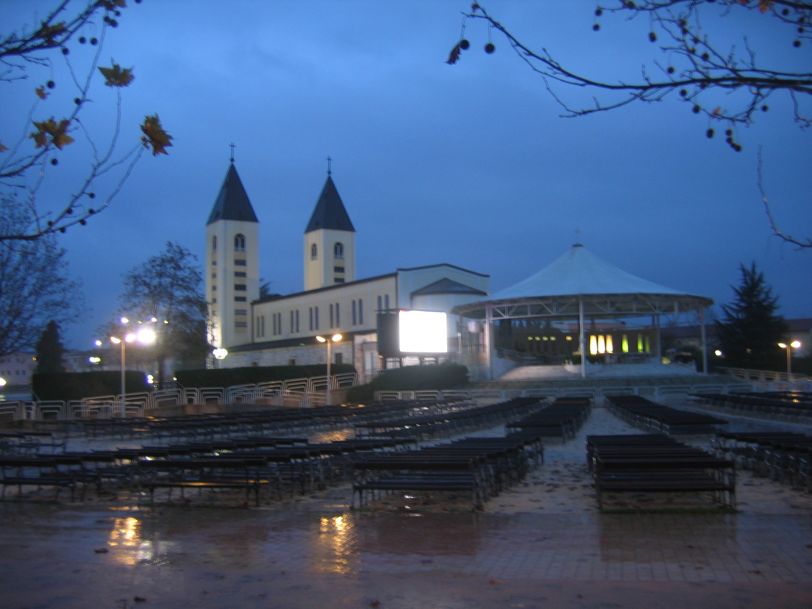 Međugorje was our next site. It had been pouring rain all day, and it was already dark by the time we arrived. Until the day before, I had not realized we would be coming, so I had not brushed up on the apparitions there, yet as the only Catholic theologian in the group, I was the default expert. Several people had not heard of the site, and were not familiar with the Catholic tradition of Marian apparitions, though some did know of either Lourdes or Fatima. There were few pilgrims in the church, and between the dark and the downpour we could not see or get up the hill. Since 1981, there have been claims of apparitions here, and the Holy See has not yet made a final decision regarding the site (and will not until the apparent apparitions abate), though the initial investigation by the local ordinary, concluded in 1986, was critical. The current status is that it remains open, and that no one is forbidden from going unless and until the message is determined to be false. At its best, the Church would never require anyone to believe in the messages, as general revelation ceased with the apostles, but would allow veneration.