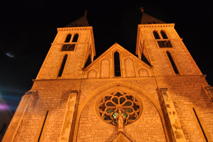 The city of Sarajevo sits in an area that has been inhabited since the Neolithic age, with a medieval settlement in the region large enough that a cathedral was established by the early 13th century. Sarajevo as it is known today is traditionally said to be established in 1461 under Ottoman rule. It is known as the Jerusalem of Europe in part for its location between east and west, and for its concentration of major religious houses of worship in such close proximity. Within less than a square kilometer one can find the Catholic and Orthodox cathedrals, the Emperor’s Mosque, and the Sephardic Synagogue, as well as other mosques and churches. We toured several during our first evening.